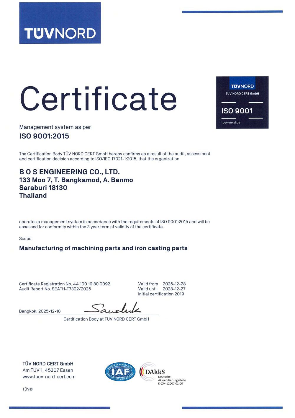 บริษัท บี.โอ.เอส. เอ็นจิเนียริ่ง จำกัด ได้ก่อตั้งในปี 2548 โดยเริ่มจากการเป็นผู้ผลิตและออกแบบแม่พิมพ์ทุกชนิดและกลึงขึ้นรูปชิ้นงาน ในปี 2549 บริษัทได้ขยายกิจการโดยเป็นผู้ผลิตชิ้นส่วนทางด้านการเกษตรในด้านงานหล่อเหล็ก ด้วยเครื่องจักรระบบอัตโนมัติเพื่อส่งออกและขายภายในประเทศ โดยจัดส่งให้บริษัทชั้นนำเพื่อไปประกอบเป็นสินค้าสำเร็จรูป และในปี 2559 บริษัทได้เห็นถึงความต้องการของชิ้นส่วนเหล็กหล่อรูปพรรณสำเร็จรูปที่มีคุณภาพสูงขึ้นจึงได้ขยายกิจการ เพื่อเข้าสู่ตลาดอุตสาหกรรมยานยนต์ โดยการลงทุนและพัฒนาการหลอมเหล็กด้วยเทคโนโลยีที่ทันสมัย อาทิเช่น ระบบเตาไฟฟ้าคุณภาพสูง แขนกลหุ่นยนต์โรบอท และพัฒนาระบบคุณภาพตามมาตรฐานสากล เพื่อตอบสนองความต้องการของลูกค้าและทำให้ลูกค้าเกิดความพึ่งพอใจสูงสุด และในปี 2566 บริษัท บี.โอ.เอส. เอ็นจิเนียริ่ง จำกัด ได้ก้าวสู่ตลาดสากล โดยการผลิตชิ้นส่วนประกอบวาล์วแรงดันและชิ้นส่วนขายึดเสาโซล่าเซลล์ และทางบริษัทยังตระหนักถึงด้านผลกระทบต่อสิ่งแวดล้อม เช่น การรีไซเคิลชิ้นงานเหล็กที่ทิ้งหรือชำรุด ซึ่งวัสดุเหล่านี้มีมูลค่า สามารถนำไปรีไซเคิลเพื่อเป็นวัสดุตั้งต้นในการผลิตเหล็กหล่อสร้างรูปพรรณใหม่ได้ การผลิตเหล็กโดยใช้เศษเหล็กรีไซเคิลนี้ ช่วยลดการทำลายธรรมชาติลงได้ ภายใต้การรับรองระบบบริหารคุณภาพ ISO 9001 : 2015 IATF 16949 : 2016 PED2014/68/EU PER2016,UK ISO 14001 : 2015 จนมาถึงปัจจุบัน